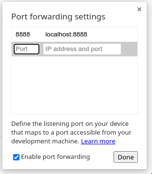 chrome://inspect/#devices. You should see your device along with a Connected status indicatorEnable Port Forwarding